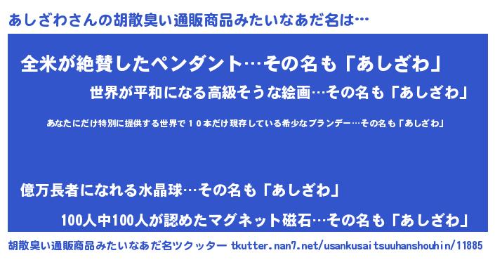 | 意味不明あだ名 | 『住所不定無職あしざわ(89歳)』 |