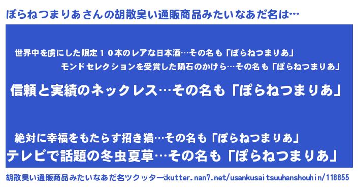 | 意味不明あだ名 | 『とにかく怪しいぽらねつまりあ』 |
