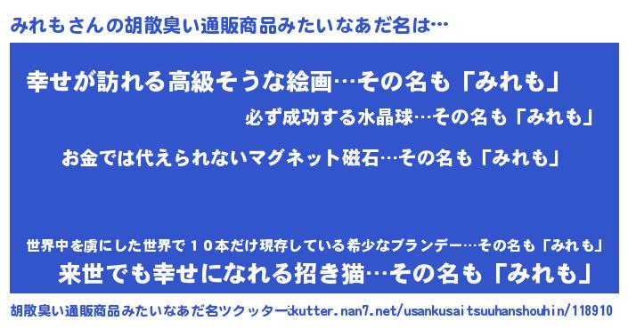 | 女子向けラノベタイトル風あだ名 | 『みれも恋絵巻』『みれもの雑貨屋さん』 |