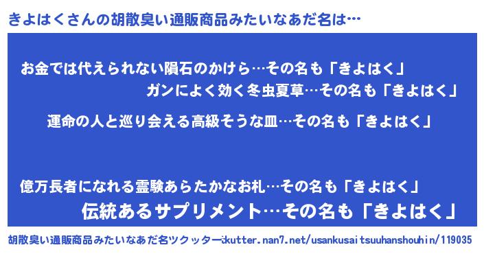 | 男性向けラノベタイトル風あだ名 | 『きよはくに滅ぼされるだけの簡単なお仕事です』 |