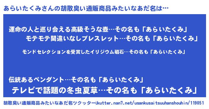 あらいたくみさんの胡散臭い通販商品みたいなあだ名をツクッター!