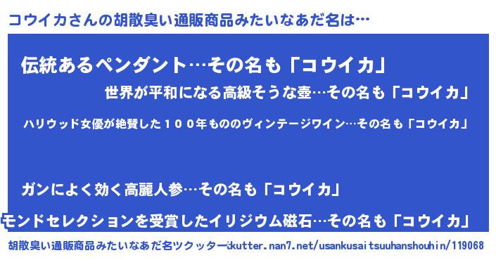 | ヘコむあだ名 | 『コウお』『豆乳』『コウイカ(笑)』 |