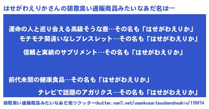 | ポケモン風あだ名 | 『ハセゴンZ』『ヒハセガワエリカ』 |