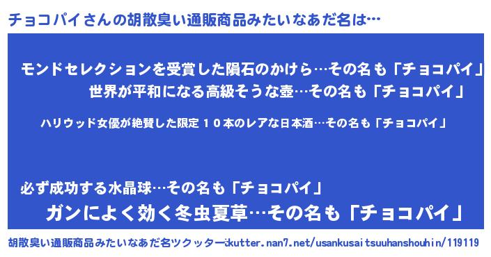 | 意味不明あだ名 | 『住所不定無職チョコパイ(68歳)』 |
