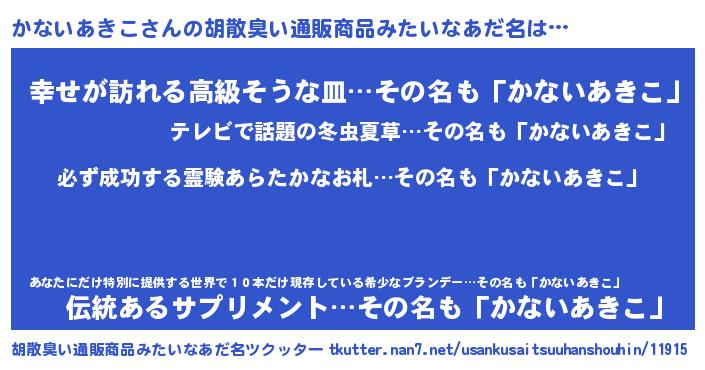 | 肩書あだ名 | 『かないあきこ中将』『かないあきこ塾長』 |
