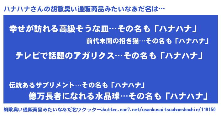| 男性向けラノベタイトル風あだ名 | 『転生したらハナハナだった件』 |