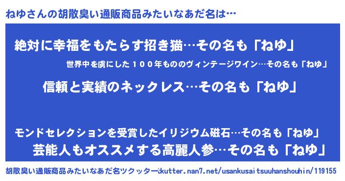 | 女子向けラノベタイトル風あだ名 | 『ねゆは平凡を望む』『ねゆアンティーク』 |
