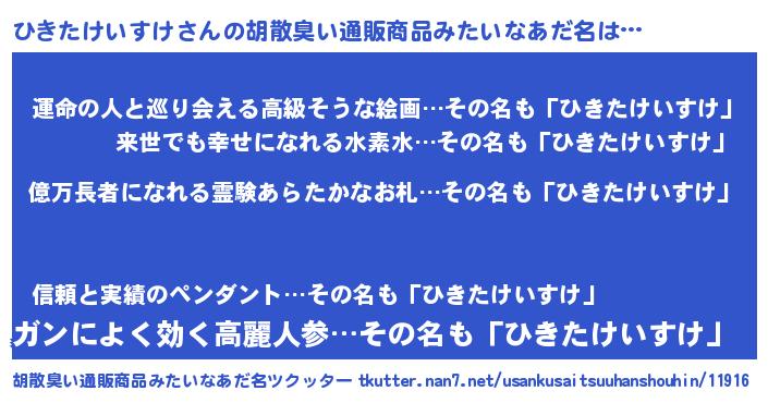 | 男性向けラノベタイトル風あだ名 | 『ひきたけいすけに滅ぼされるだけの簡単なお仕事です』 |