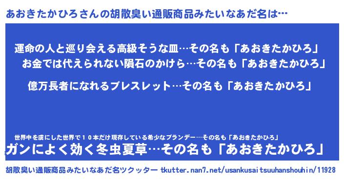| 男性向けラノベタイトル風あだ名 | 『うちのあおきたかひろが世界を掌握している!』 |