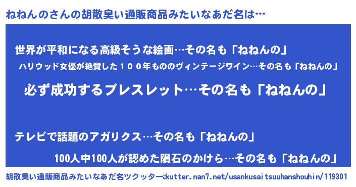 | 男性向けラノベタイトル風あだ名 | 『ねねんのの憂鬱』『ネネンノスレイヤー』 |