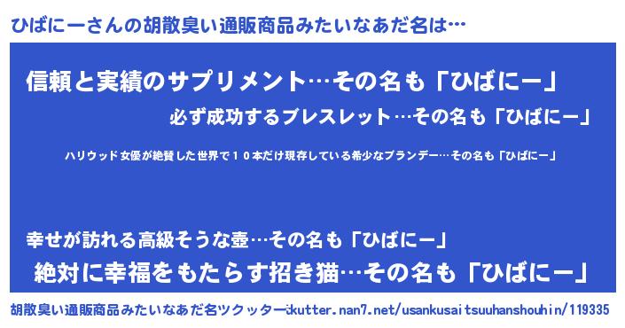 | 意味不明あだ名 | 『住所不定無職ひばにー(86歳)』 |