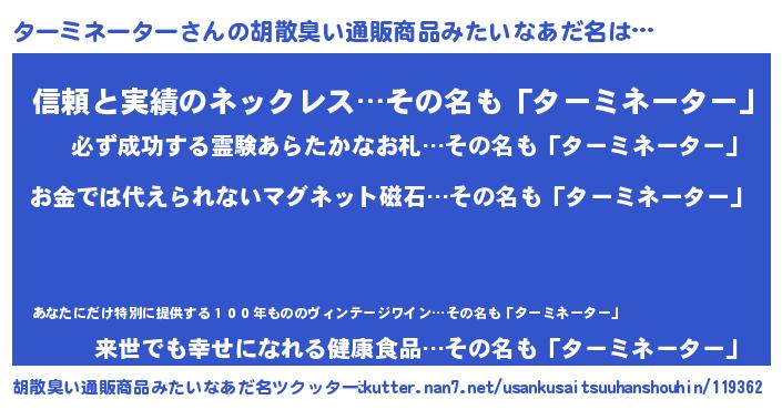 | 男性向けラノベタイトル風あだ名 | 『おまえをオタクにしてやるから、俺をターミネーターにしてくれ! 』 |