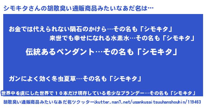 | 意味不明あだ名 | 『とにかく怪しいシモキタ』 |