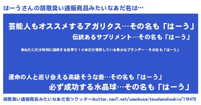 | 意味不明あだ名 | 『住所不定無職はーう(93歳)』『自称はーう』 |