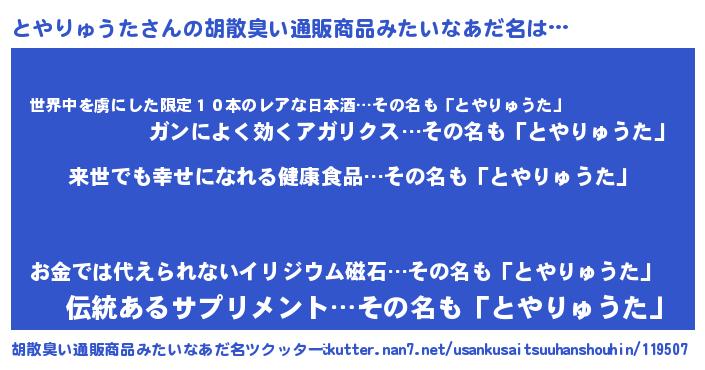 | 男性向けラノベタイトル風あだ名 | 『とやりゅうたという概念が存在しない退屈な世界 』 |
