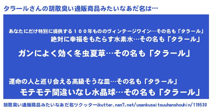 | 女子向けラノベタイトル風あだ名 | 『タラールなんてお断りですっ。』 |