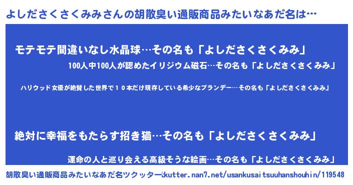 | 意味不明あだ名 | 『住所不定無職よしださくさくみみ(86歳)』 |