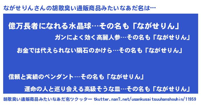 | 男性向けラノベタイトル風あだ名 | 『おまえをオタクにしてやるから、俺をながせりんにしてくれ! 』 |