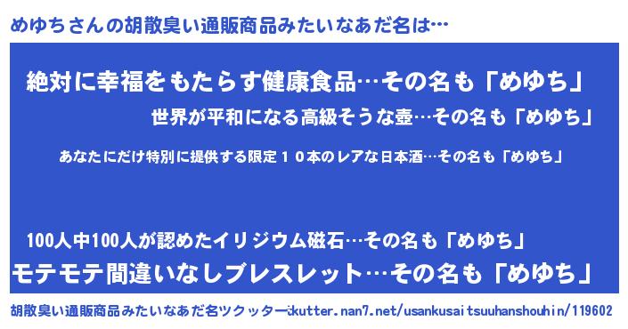 | 男性向けラノベタイトル風あだ名 | 『この素晴らしい世界にめゆちを!』 |