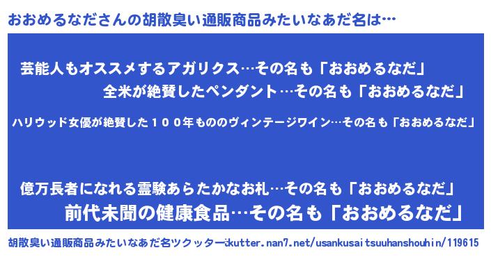| 意味不明あだ名 | 『住所不定無職おおめるなだ(2歳)』 |