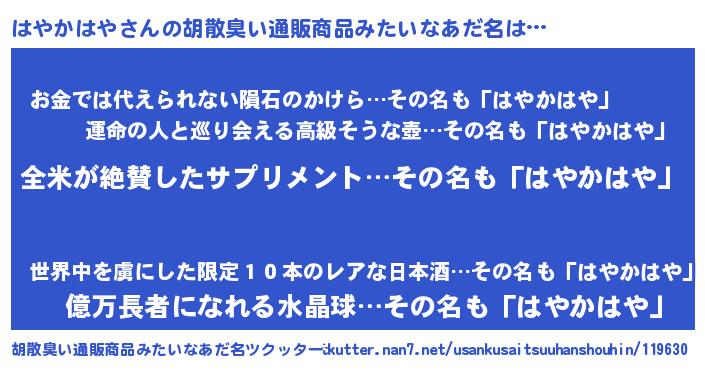 | 男性向けラノベタイトル風あだ名 | 『はやかはやの嫁は女の子じゃないと思った?』 |