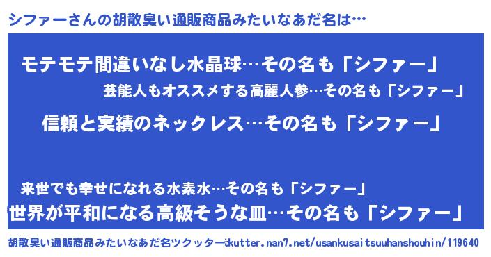| 男性向けラノベタイトル風あだ名 | 『ダンジョンにシファーを求めるのは間違っているだろうか』 |
