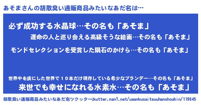| ヘコむあだ名 | 『あそっふぃ~』『あそま(苦笑)』 |
