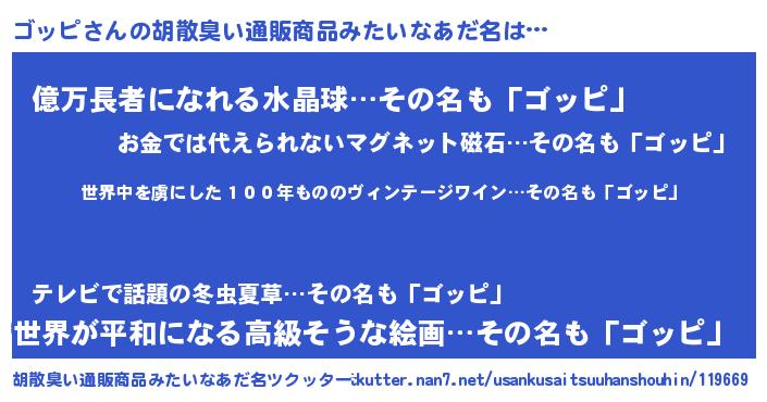 | 意味不明あだ名 | 『住所不定無職ゴッピ(13歳)』『自称ゴッピ』 |