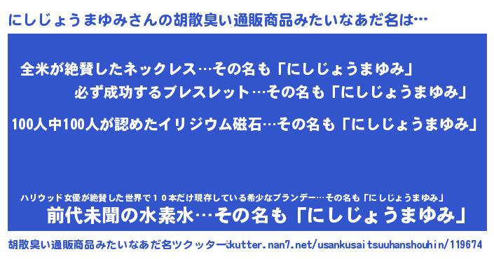 | 男性向けラノベタイトル風あだ名 | 『おまえをオタクにしてやるから、俺をにしじょうまゆみにしてくれ! 』 |