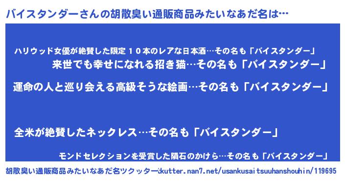 | 男性向けラノベタイトル風あだ名 | 『バイスタンダーに滅ぼされるだけの簡単なお仕事です』 |