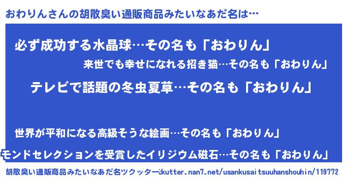 | 意味不明あだ名 | 『自称おわりん』『ペロリンおわりん』 |