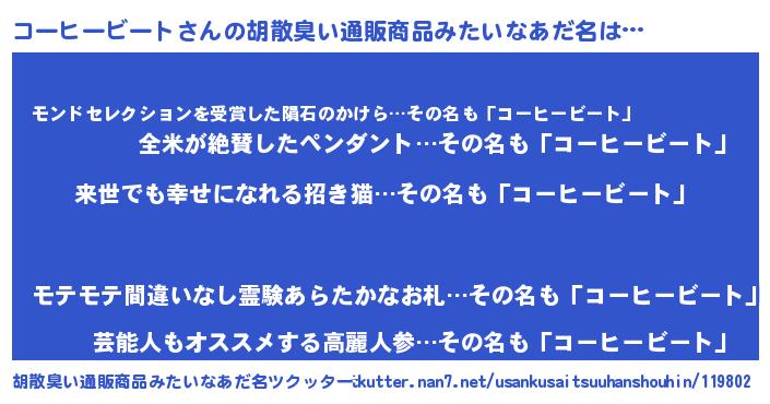 | 男性向けラノベタイトル風あだ名 | 『コーヒービートに滅ぼされるだけの簡単なお仕事です』 |