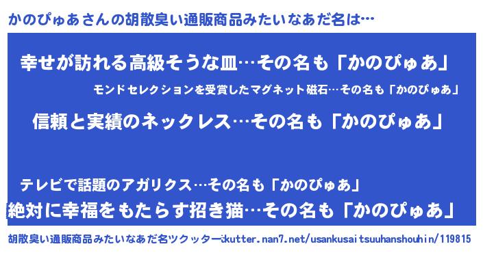 | 意味不明あだ名 | 『とにかく怪しいかのぴゅあ』 |