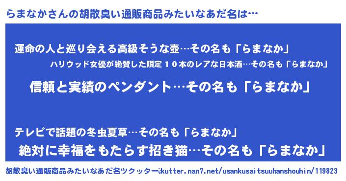 | 女子向けラノベタイトル風あだ名 | 『らまなかは平凡を望む』 |
