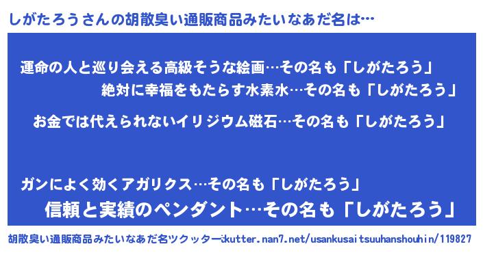 | 男性向けラノベタイトル風あだ名 | 『ノーゲーム・ノーシガタロウ』 |
