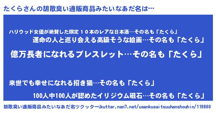 | ヘコむあだ名 | 『たくふぇ~』『つくし』『たく太郎』 |