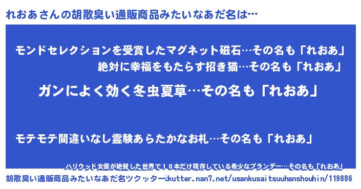 | 意味不明あだ名 | 『自称れおあ』『眠気覚ましガムれおあ味』 |