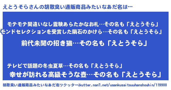 | ヘコむあだ名 | 『えとうそら(笑)』『えとにゅー』 |