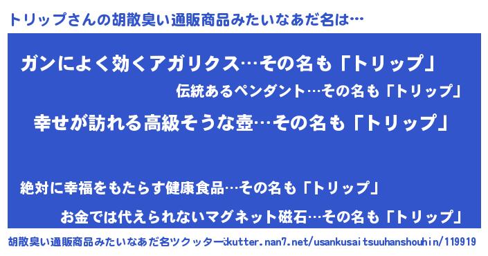 | 女子向けラノベタイトル風あだ名 | 『トリップの雑貨屋さん』『闇のトリップ』 |