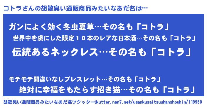 | 意味不明あだ名 | 『とにかく怪しいコトラ』『自称コトラ』 |