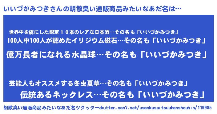 | 男性向けラノベタイトル風あだ名 | 『いいづかみつき~年齢イコール彼女いない歴の魔法使い~』 |