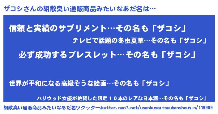 | 男性向けラノベタイトル風あだ名 | 『ザコシスレイヤー』『ザコシの憂鬱』 |
