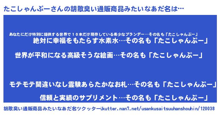 | 男性向けラノベタイトル風あだ名 | 『転生したらたこしゃんぷーだった件』 |