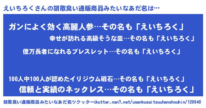 | 意味不明あだ名 | 『ペロリンえいちろく』『自称えいちろく』 |