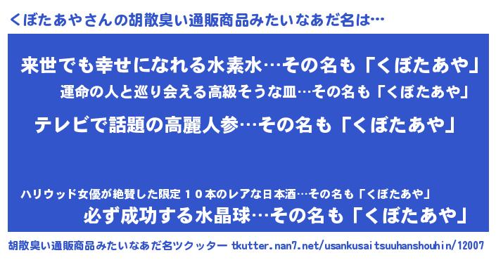 | 男性向けラノベタイトル風あだ名 | 『Re:くぼたあやから始める異世界生活』 |