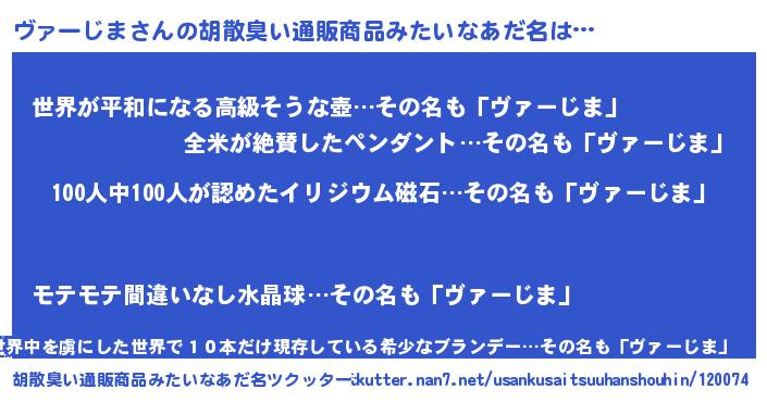 | 男性向けラノベタイトル風あだ名 | 『おまえをオタクにしてやるから、俺をヴァーじまにしてくれ! 』 |