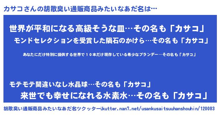 | 意味不明あだ名 | 『住所不定無職カサコ(86歳)』 |