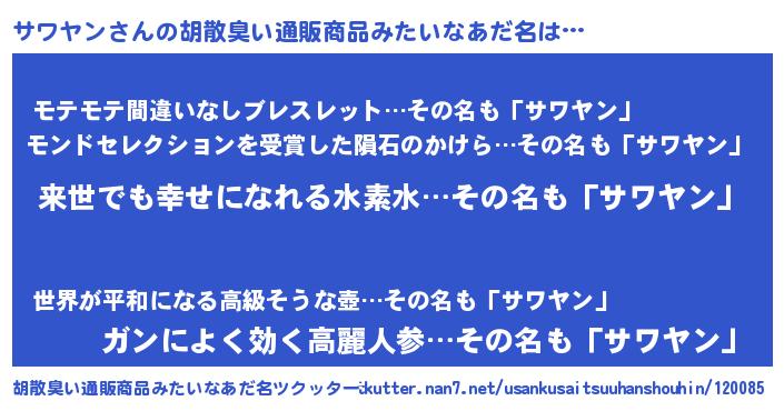 | 意味不明あだ名 | 『なめこ科サワヤン属』『自称サワヤン』 |