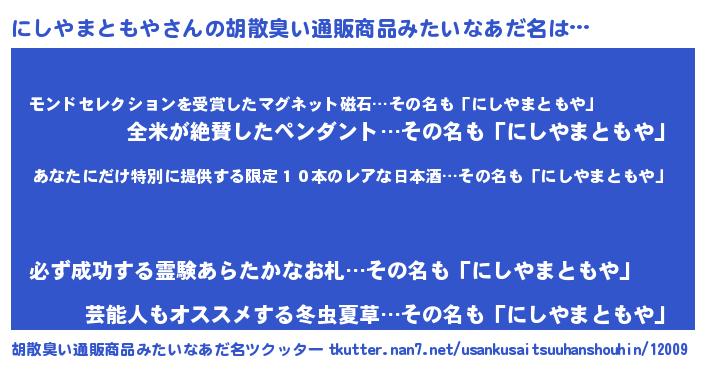 | 男性向けラノベタイトル風あだ名 | 『にしやまともや~年齢イコール彼女いない歴の魔法使い~』 |