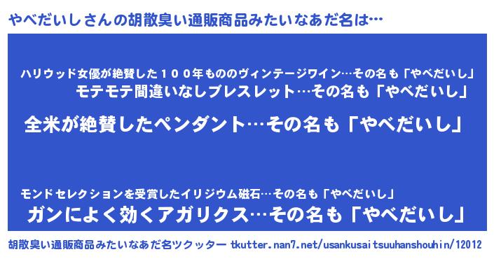 | 意味不明あだ名 | 『とにかく怪しいやべだいし』 |